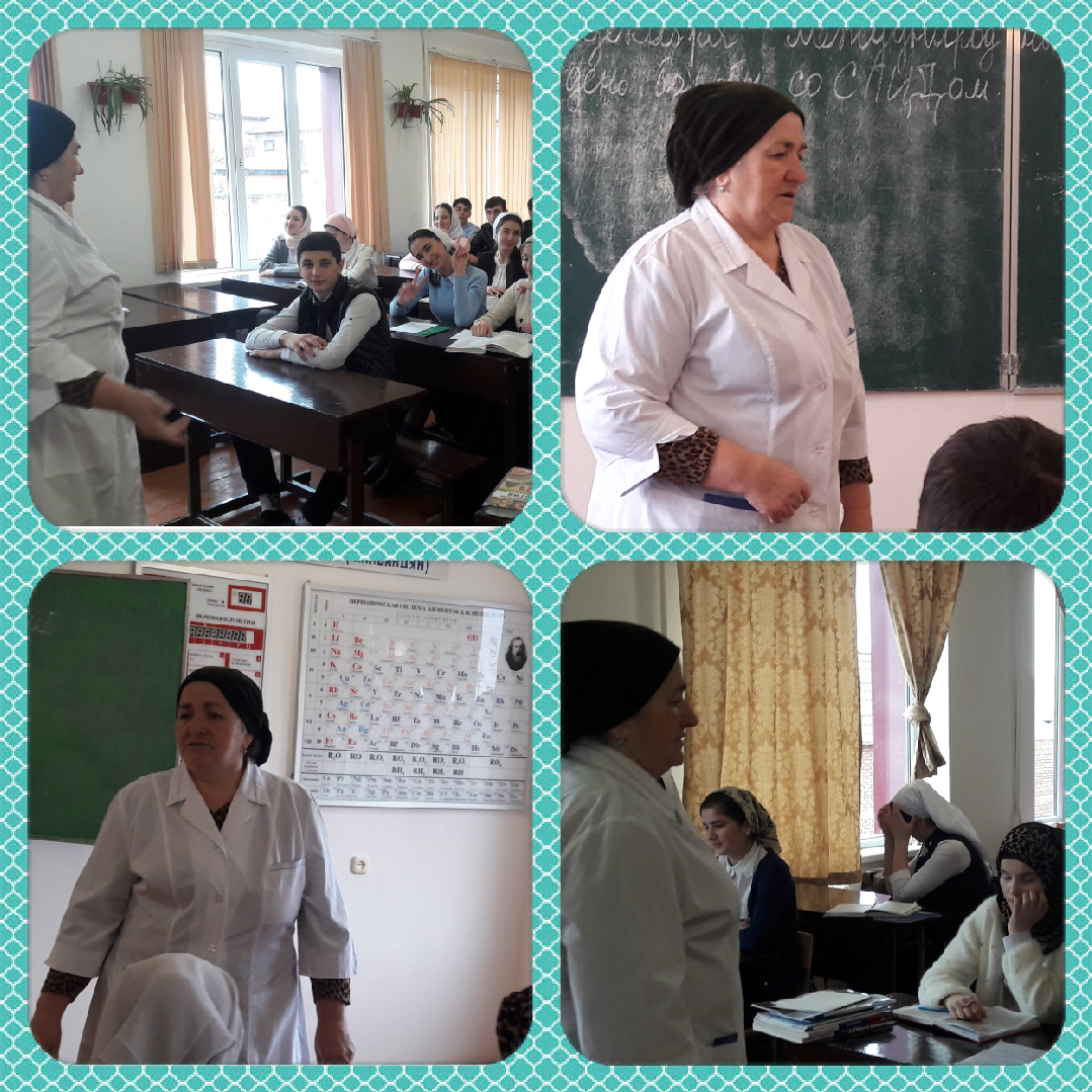 Беседу провела медицинская сестра Майртупского ФАП Висаева Т.. В своем выступлении она рассказала об истории распространения СПИДа во всем мире и ознакомила присутствующих со статистикой заболевания жителей Чеченской республики. Она рассказала также о симптомах и признаках этого заболевания. Далее Висаевой Т. было рассказано о способах заболевания и мерах предосторожности по предупреждению этого заболевания.